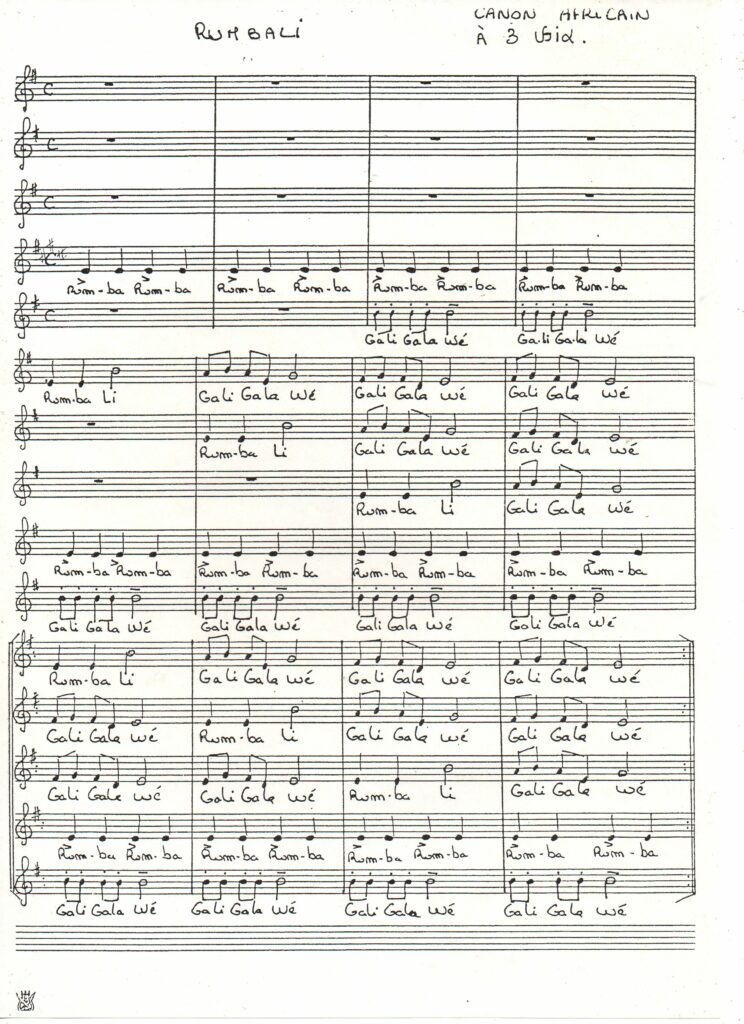 Rumbali Laisser un commentaire / Par Christine / 5 janvier 2026 Chant africain qui peut être chanté en canon à 3 voix et avec ostinato Chant : Rumbali galigalawé, galigalawé, galigalawé Ostinato 1: Rumba, rumba etc. Ostinato 2: Galigalawé, galigalawé etc... Autre version proposée ici En lien avec cet article: Minuit inuit Vassilis l’enfant grec Pays du monde La flûte indienne